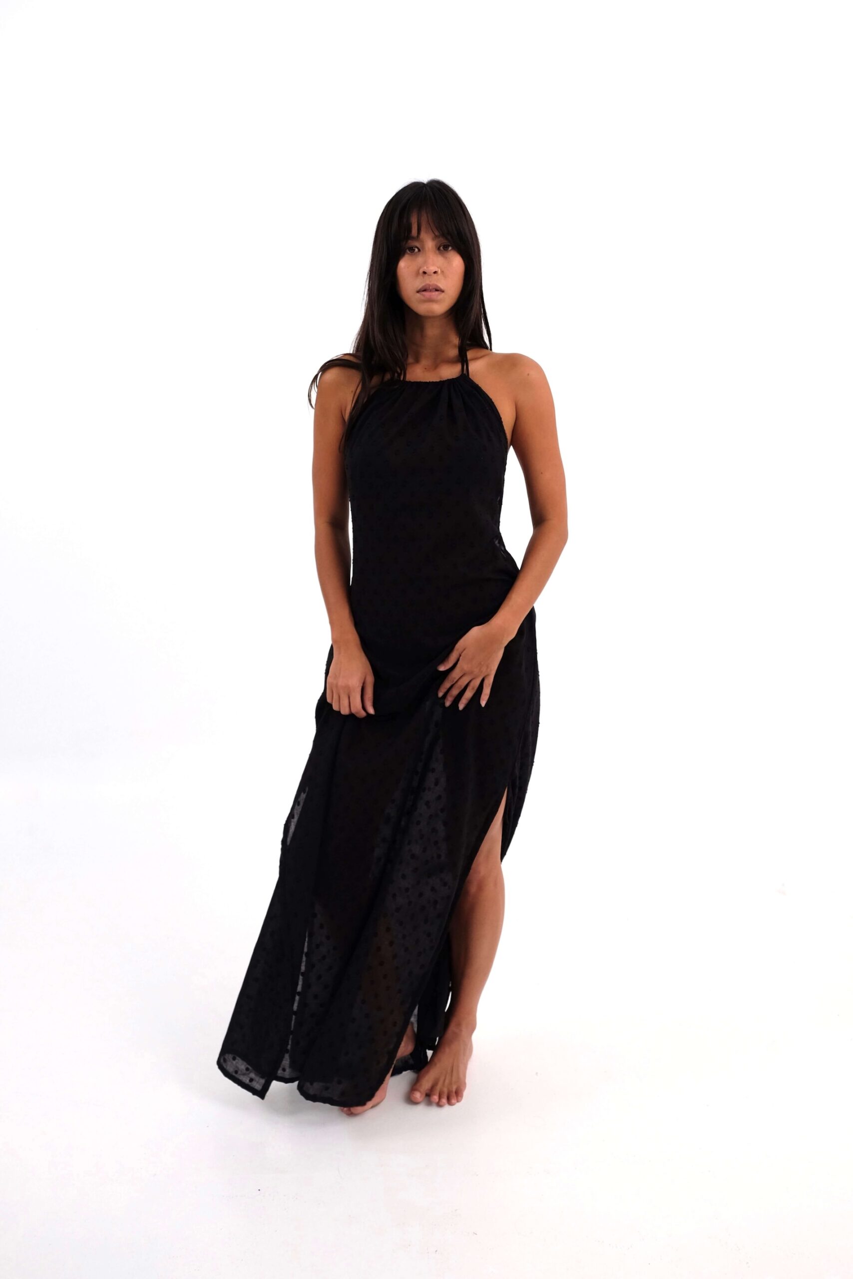Marilena Polka Dot Dress, a lightweight, breezy piece. Crafted from sheer, soft cotton, it drapes gently over the body for breathable comfort in warm island Bali weather.